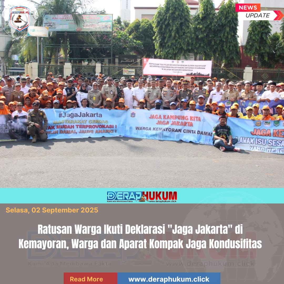 Jakarta Pusat, | Deraphukum.click | Sekitar 200 orang dari berbagai elemen masyarakat mengikuti kegiatan Deklarasi Jaga Jakarta yang digelar di Bundaran Masjid Akbar Kemayoran, Jakarta Pusat, pada Selasa (2/9/2025) pagi.