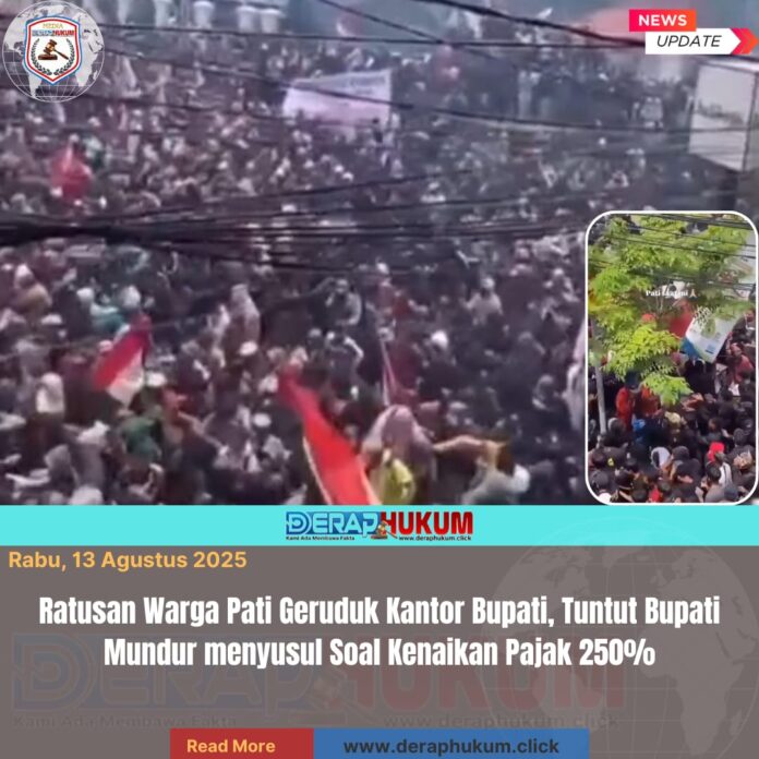 Pati, Jawa Tengah | Deraphukum.click | Ratusan warga dari berbagai kecamatan di Kabupaten Pati menggelar aksi demonstrasi besar-besaran di depan kantor Bupati Pati, Rabu (13/8/2025). Massa yang tergabung dari kelompok pedagang, petani, nelayan, hingga pelaku usaha kecil ini menuntut Bupati Pati mundur dari jabatannya, menyusul kebijakan kenaikan pajak daerah yang disebut mencapai 250 persen.