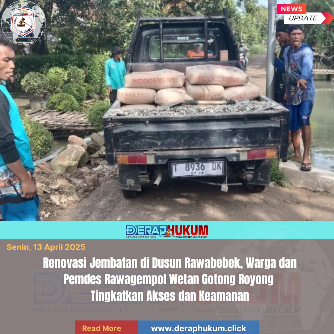 Minggu, 12 April 2026, pukul 09.00 WIB, telah dilaksanakan kegiatan renovasi jembatan yang berlokasi di Dusun Rawabebek, RT 18/RW 07, Desa Rawagempol Wetan, Kabupaten Karawang. Kegiatan ini merupakan bagian dari upaya peningkatan infrastruktur desa guna menunjang aktivitas masyarakat sehari-hari.