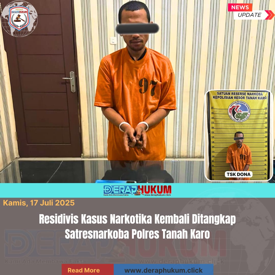 KARO, Sumatera Utara | Deraphukum.click | Seorang pria berinisial D (30), yang merupakan residivis kasus narkotika, kembali harus berurusan dengan hukum setelah ditangkap oleh personel Satresnarkoba Polres Tanah Karo pada Senin (14/7/2025) sekitar pukul 16.30 WIB.