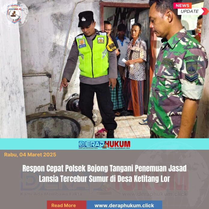 Pekalongan,Jawa Tengah | Deraphukum.click | Polres Pekalongan Polda Jateng – Personel Polsek Bojong bergerak cepat mendatangi lokasi kejadian penemuan jasad seorang kakek yang tercebur ke dalam sumur di Desa Ketitang Lor, Kecamatan Bojong, Kabupaten Pekalongan, Selasa (3/3/2026) malam. Korban berinisial R (90), ditemukan dalam kondisi meninggal dunia usai pihak keluarga melakukan pencarian selama beberapa jam.