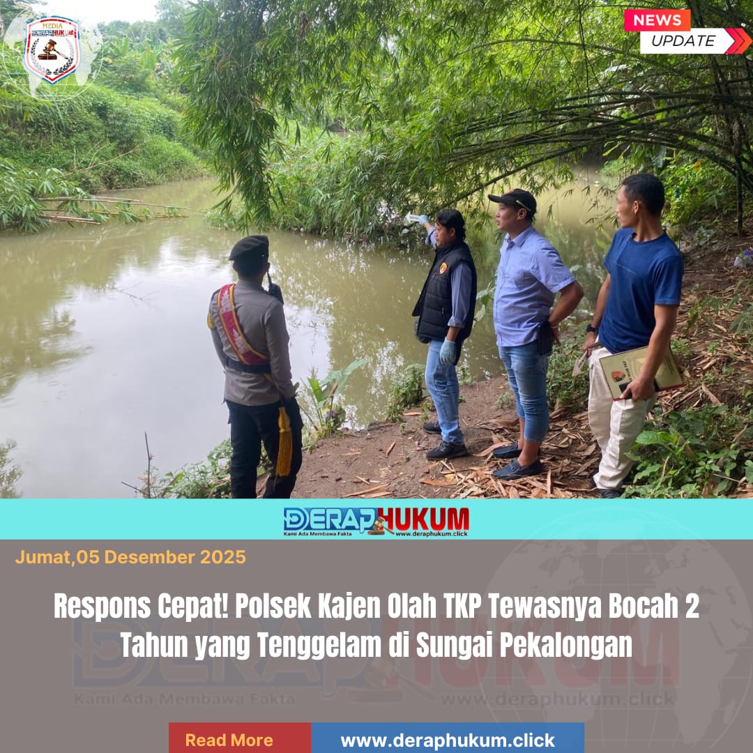 Pekalongan,Jawa Tengah | Deraphukum.click | Polres Pekalongan – Polda Jateng – Duka mendalam menyelimuti Desa Pekiringan Alit, Kecamatan Kajen, Kabupaten Pekalongan. Seorang bocah laki-laki berusia 2 tahun, berinisial MK, ditemukan meninggal dunia akibat tenggelam di aliran sungai yang berada tak jauh dari rumahnya, Kamis (4/12/2025).