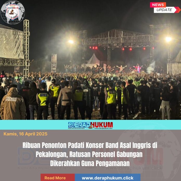 Pekalongan,Jawa Tengah | Deraphukum.click | Polres Pekalongan – Polda Jateng – Aparat gabungan berhasil mengamankan jalannya konser musik yang menghadirkan grup asal Inggris, Booze and Glory. Dalam kesempatan itu pula, tampil band Over Distortion. Konser musik digelar di lapangan Panorama 25 Bojong, Kabupaten Pekalongan, pada Selasa (14/4/2025).