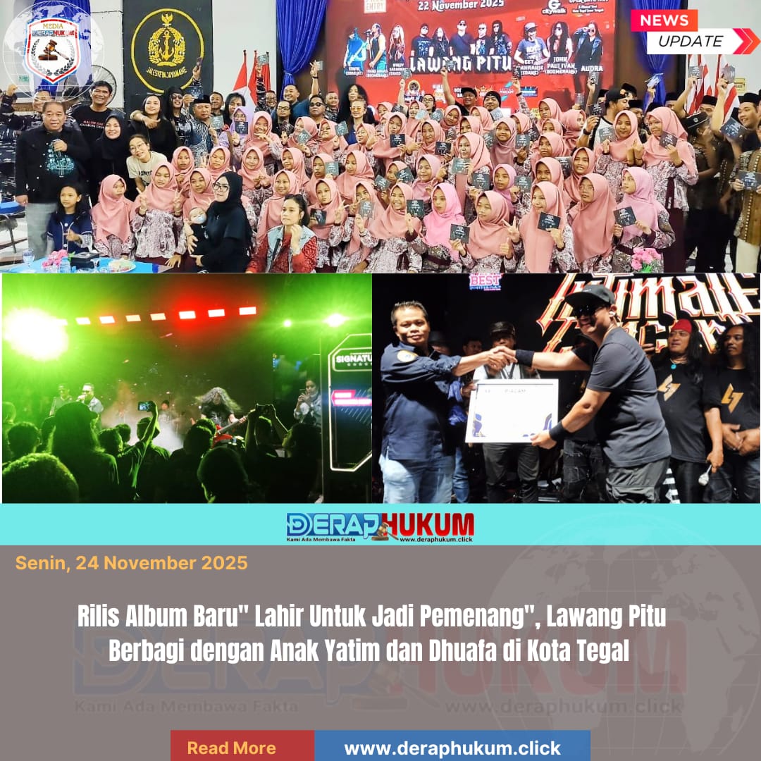 Kota Tegal,Jawa Tengah | Deraphukum.click | Band rock Lawang Pitu menunjukkan komitmen sosialnya melalui kegiatan berbagi kepada yatim dan dhuafa, yang dilaksanakan bersamaan dengan konferensi pers peluncuran album kedua mereka bertajuk “Lahir Untuk Jadi Pemenang”, pada Sabtu, 22 November 2025, di Aula CA IV, Pangkalan TNI AL Kota Tegal.