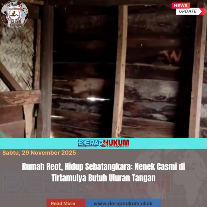 Karawang, Jawa Barat | Deraphukum.click | Nasib malang dialami oleh Casmi (70), warga Kampung Bakansampeu RT 01/03 Desa Cipondoh, Kecamatan Tirtamulya, Kabupaten Karawang. Di usianya yang sudah renta, ia hidup sebatangkara di sebuah rumah reot yang jauh dari kata layak huni.