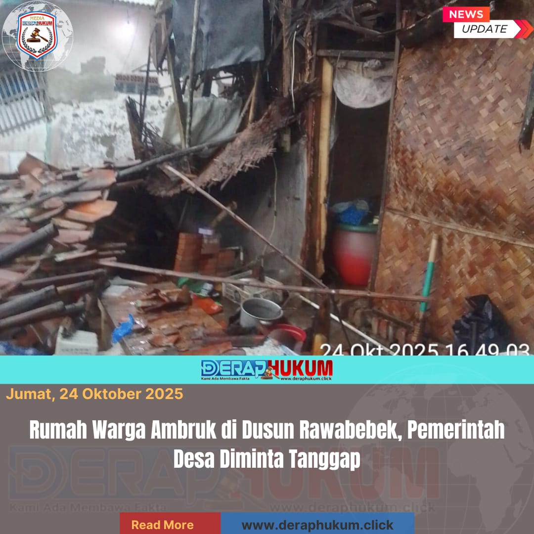 KARAWANG, JAWA BARAT | Deraphukum.click | Hujan deras yang mengguyur wilayah Cilamaya Wetan pada Kamis sore (24/10/2025) menyebabkan rumah milik Nurwenda, warga Dusun Rawabebek RT 021 Desa Rawagempol Wetan, ambruk dan rata dengan tanah.