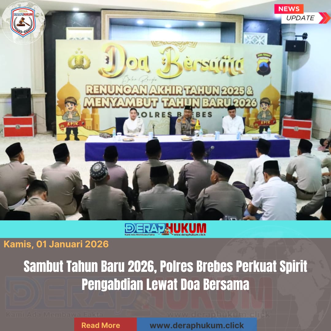 BREBES, Jawa Tengah | DerapHukum.click | Menyambut pergantian tahun, Polres Brebes menggelar Doa Bersama dan Renungan Akhir Tahun 2025 sekaligus menyongsong Tahun Baru 2026, Rabu malam (31/12/2025). Kegiatan berlangsung khidmat di Masjid Baitul Muttaqin Polres Brebes dan diikuti jajaran pimpinan daerah serta seluruh personel kepolisian.
