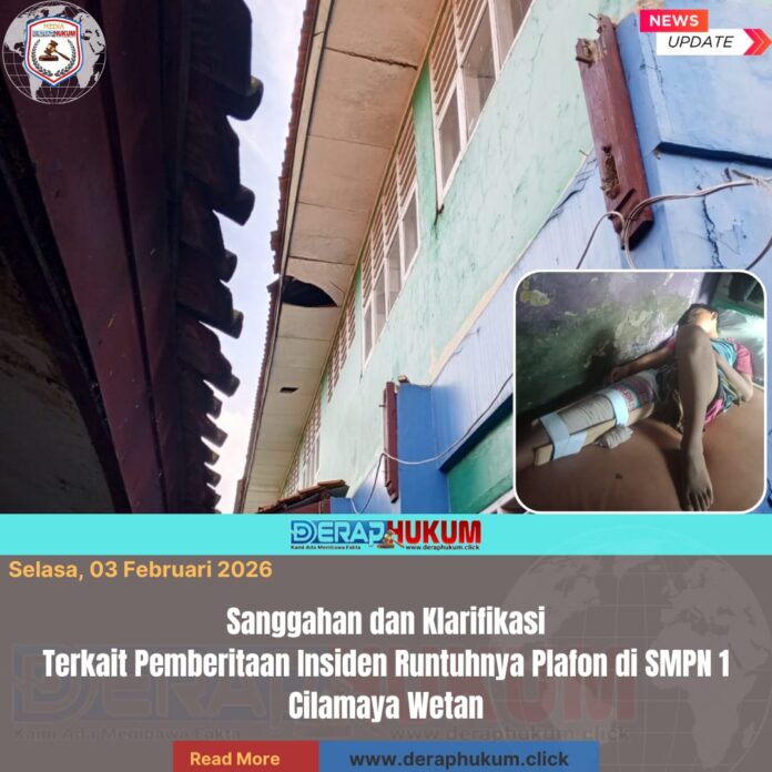Karawang, Jawa Barat | DerapHukum.click | Menindaklanjuti pemberitaan yang beredar terkait insiden runtuhnya plafon di SMP Negeri 1 Cilamaya Wetan yang menyebabkan salah satu siswa, Irsyad Aksan (14), mengalami cedera, Tim Media Derap Hukum telah melakukan klarifikasi langsung ke lokasi kejadian serta menemui pihak sekolah guna memastikan kebenaran informasi secara berimbang.
