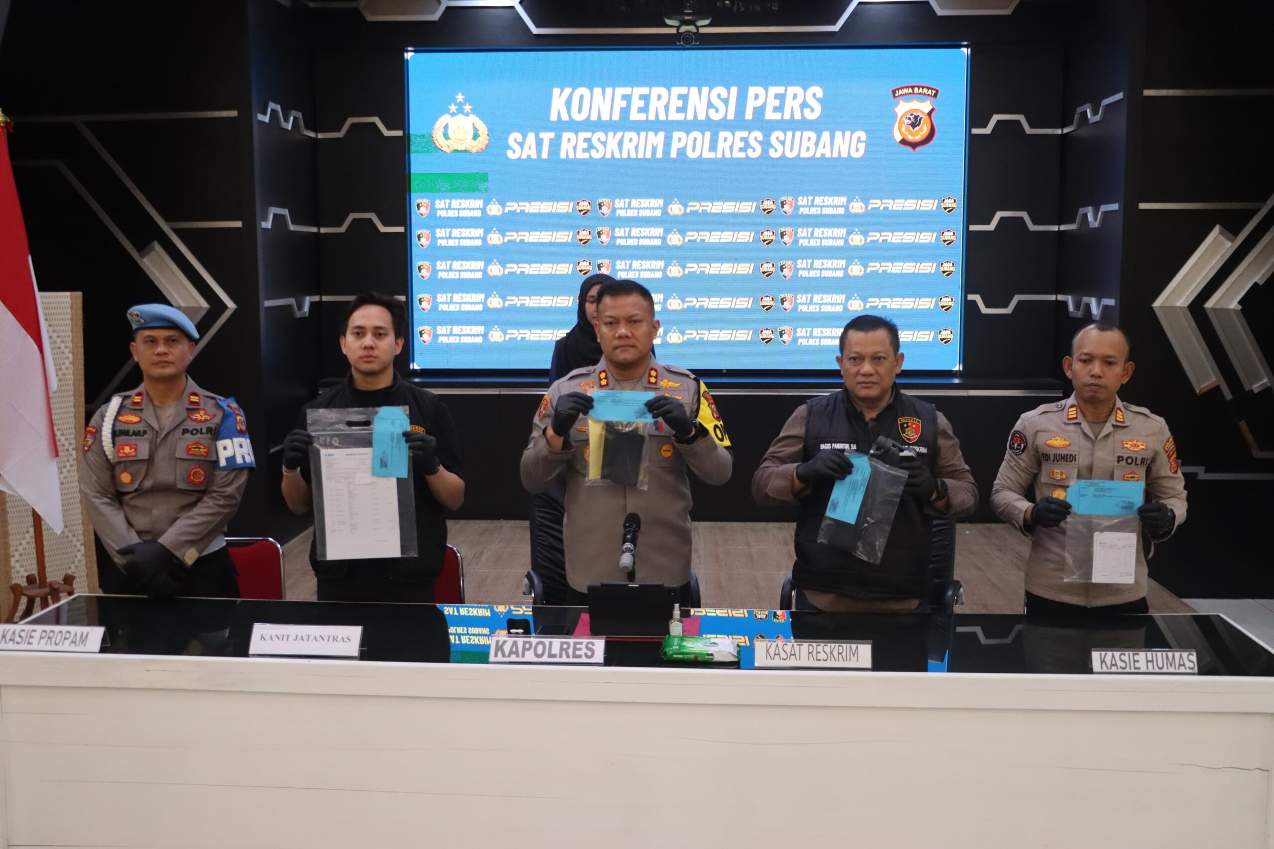Konferensi pers dipimpin langsung oleh Kapolres Subang AKBP Dony Eko Wicaksono, S.H., S.I.K., M.H., Ph.D., didampingi Kasat Reskrim Polres Subang, Kasi Humas, Kasi Propam, Kanit Jatanras, serta personel Sat Reskrim Polres Subang.