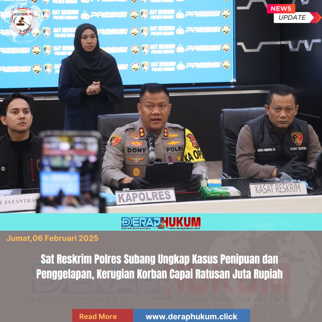 Subang,Jawa Barat l Deraphukum.click l Satuan Reserse Kriminal (Sat Reskrim) Polres Subang menggelar konferensi pers pengungkapan kasus tindak pidana penipuan dan penggelapan yang mengakibatkan kerugian korban hingga ratusan juta rupiah. Kegiatan berlangsung di Aula Patriatama Polres Subang, Jumat (6/2/2026) pukul 10.30 WIB.