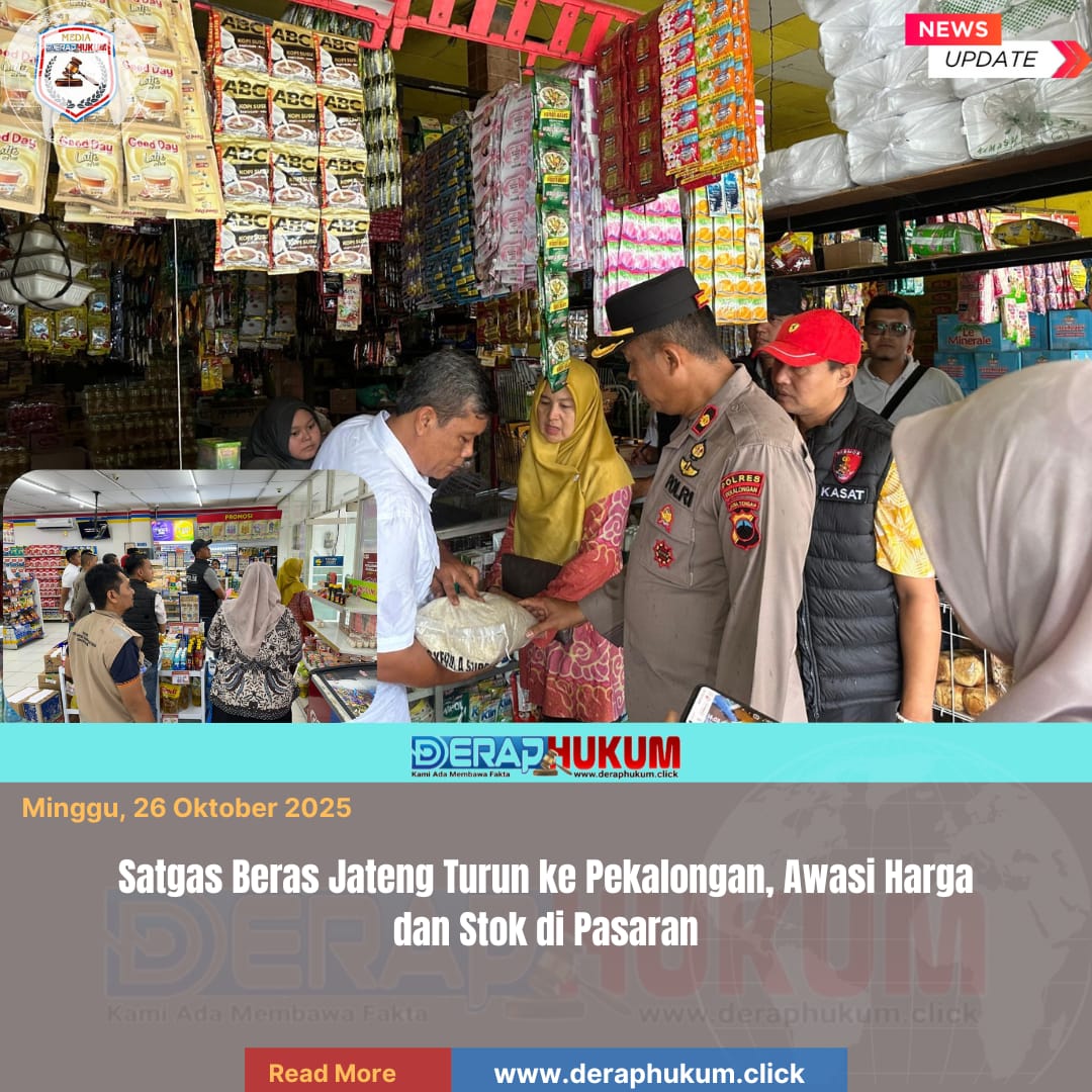 Pekalongan,Jawa Tengah | Deraphukum.click | Polres Pekalongan – Polda Jateng – Satuan Tugas (Satgas) Pengendalian Harga Beras Provinsi Jawa Tengah melakukan pemantauan langsung ke sejumlah pasar dan toko di Kabupaten Pekalongan, Jumat (24/10/2025). Langkah ini dilakukan untuk memastikan harga beras di wilayah tersebut tetap sesuai dengan Harga Eceran Tertinggi (HET) yang telah ditetapkan pemerintah.