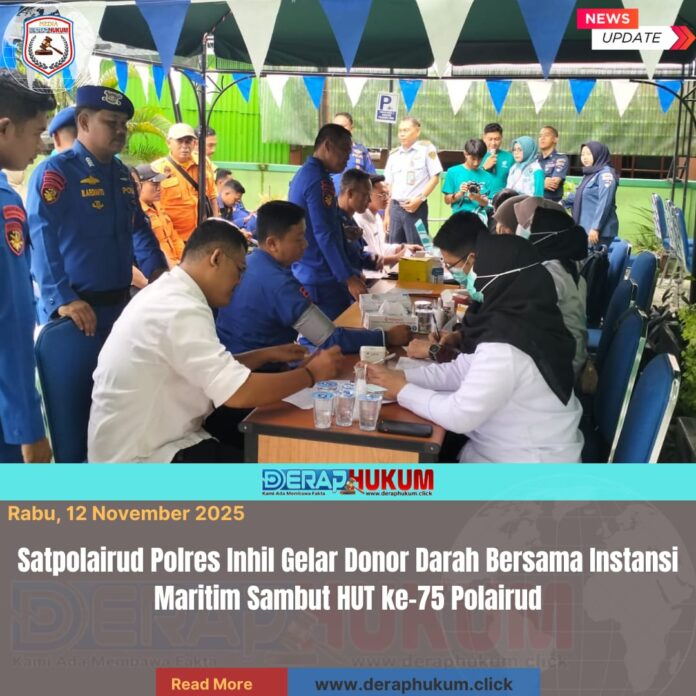 TEMBILAHAN, RIAU | DerapHukum.click | 12 November 2025 – Dalam rangka memperingati Hari Ulang Tahun (HUT) ke-75 Polisi Perairan dan Udara (Polairud) Tahun 2025, Satuan Polisi Perairan dan Udara (Satpolairud) Polres Indragiri Hilir menggelar kegiatan donor darah yang diikuti oleh personel Satpolairud serta berbagai instansi maritim di wilayah Tembilahan.