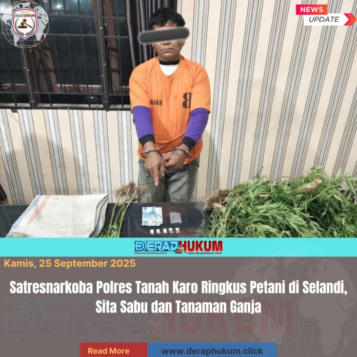 KARO, SUMATERA UTARA l Deraphukum.click l Personel Opsnal Satresnarkoba Polres Tanah Karo yang dipimpin Kanit 2 Opsnal Ipda Romy Gintint, S.H, berhasil meringkus seorang pria berinisial HB alias GB (48), warga Desa Selandi, Kecamatan Payung, Kabupaten Karo. Tersangka yang berprofesi sebagai petani itu ditangkap saat berada di areal perladangan di Desa Selandi pada Selasa (23/9/2025) sekira pukul 16.30 WIB.
