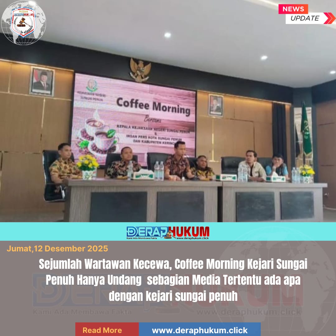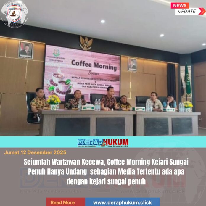 Sungai Penuh, | Deraphukum.click | Kegiatan coffee morning yang diselenggarakan oleh Kejaksaan Negeri Sungai Penuh pada Jumat (12/12/2025) bersama insan pers menuai sorotan dan meninggalkan kekecewaan bagi sejumlah wartawan. Acara yang sejatinya bertujuan mempererat hubungan serta memperkuat sinergi antara aparat penegak hukum dan media tersebut justru dinilai tidak melibatkan seluruh pihak yang selama ini aktif melakukan peliputan di wilayah Kota Sungai Penuh dan Kabupaten Kerinci.