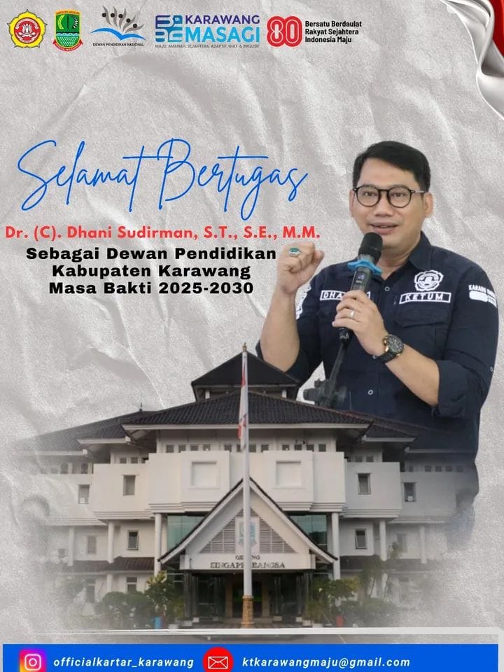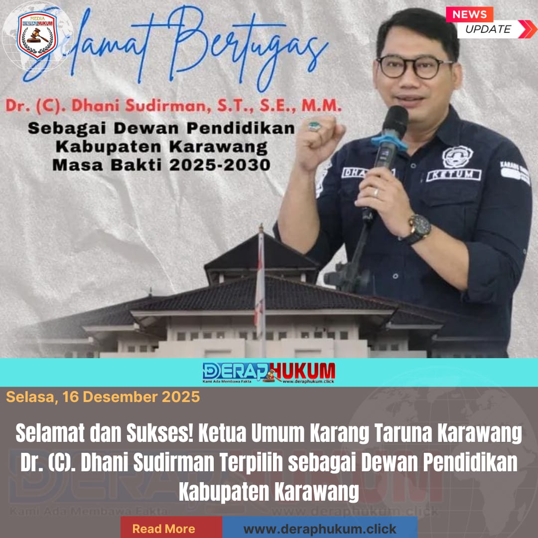 KARAWANG, Jawa Barat | Deraphukum.click | Kabar membanggakan datang dari dunia pendidikan dan kepemudaan Kabupaten Karawang. Ketua Umum Karang Taruna Karawang, Dr. (C). Dhani Sudirman, S.T., S.E., M.M., resmi terpilih sebagai Anggota Dewan Pendidikan Kabupaten Karawang Masa Bakti 2025–2030.
