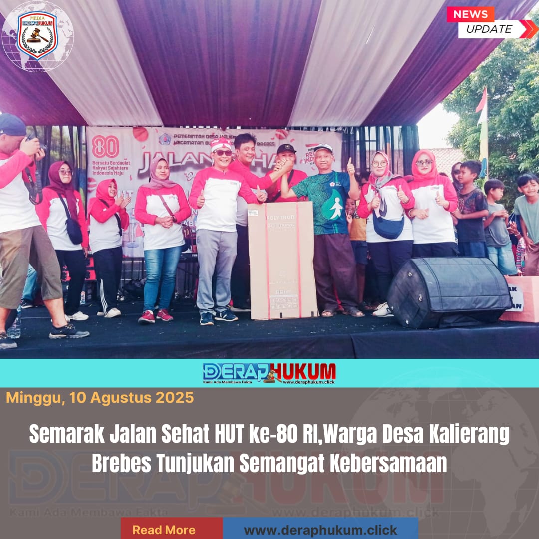 Brebes, Jawa Tengah | DerapHukum.click.|Ribuan warga dari berbagai lapisan masyarakat dengan penuh antusias mengikuti acara jalan sehat yang digelar oleh Pemdes Kalierang Kecamatan Bumiayu Kabupaten Brebes,dalam rangka memperingati Hari Ulang Tahun (HUT) ke-80 RI