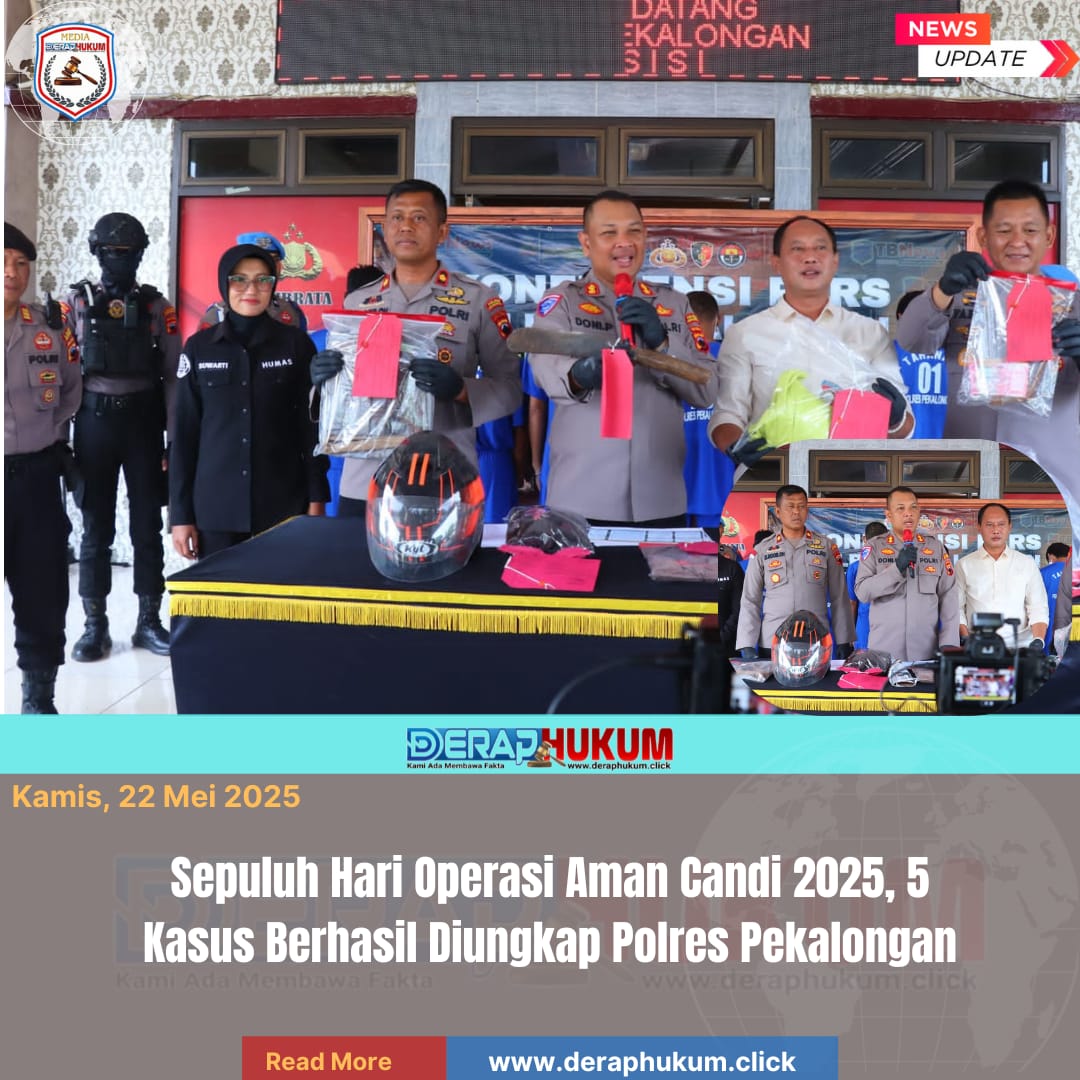 Pekalongan,Jawa Tengah | DerapHukum.Click | Polres Pekalongan – Polda Jateng – Sepuluh hari gelaran Operasi Aman Candi 2025, Polres Pekalongan berhasil mengungkap 5 kasus dengan 6 tersangka. Ops Aman Candi sendiri akan berlangsung selama 20 hari terhitung mulai tanggal 12 Mei hingga 31 Mei 2025 nanti.