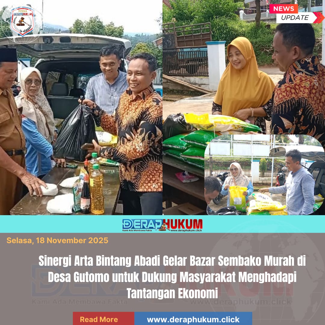 Pekalongan,Jawa Tengah | Deraphukum.click | Dalam upaya mendukung masyarakat menghadapi tantangan ekonomi yang semakin berat, PT Sinergi Arta Bintang Abadi yang dipimpin oleh M. Hasan Binsa dan Riza Fahrullah, bekerja sama dengan Pemerintah Kelurahan/Desa, menggelar program “Peduli Bazar Sembako Murah”. Kegiatan ini berlangsung di Balai Desa Gutomo, Kecamatan Karanganyar, Kabupaten Pekalongan, pada hari Senin, 17 November 2025.