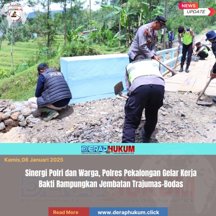 Pekalongan,Jawa Tengah | Deraphukum.click | Polres Pekalongan – Polda Jateng – Akses vital yang menghubungkan Desa Trajumas dan Desa Bodas di Kecamatan Kandangserang, Kabupaten Pekalongan, kini selangkah lagi menuju tuntas. Sejumlah personel dari Polres Pekalongan diterjunkan langsung ke lokasi untuk membantu percepatan penyelesaian pembangunan jembatan tersebut, Rabu (7/1/2026).