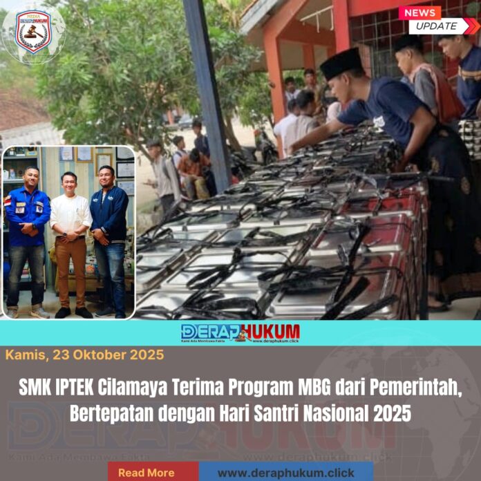 Karawang, Jawa Barat | Deraphukum.click | Suasana penuh semangat terlihat di halaman SMK IPTEK Cilamaya, Kecamatan Cilamaya Wetan, Kabupaten Karawang, pada Rabu (23/10/2025). Bertepatan dengan peringatan Hari Santri Nasional, sekolah tersebut resmi menerima dan menyalurkan program MBG (Makan Bergizi Gratis) dari pemerintah.