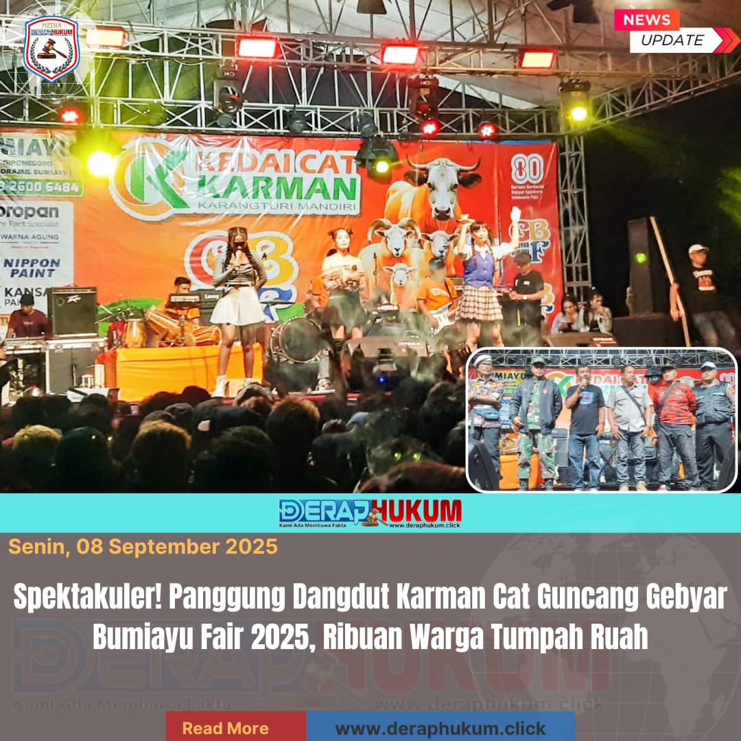 Ribuan warga memadati Lapangan Asri, Kecamatan Bumiayu, Minggu malam (7/9/2025), untuk menyaksikan penampilan panggung dangdut yang kembali dipersembahkan oleh Karman Cat.