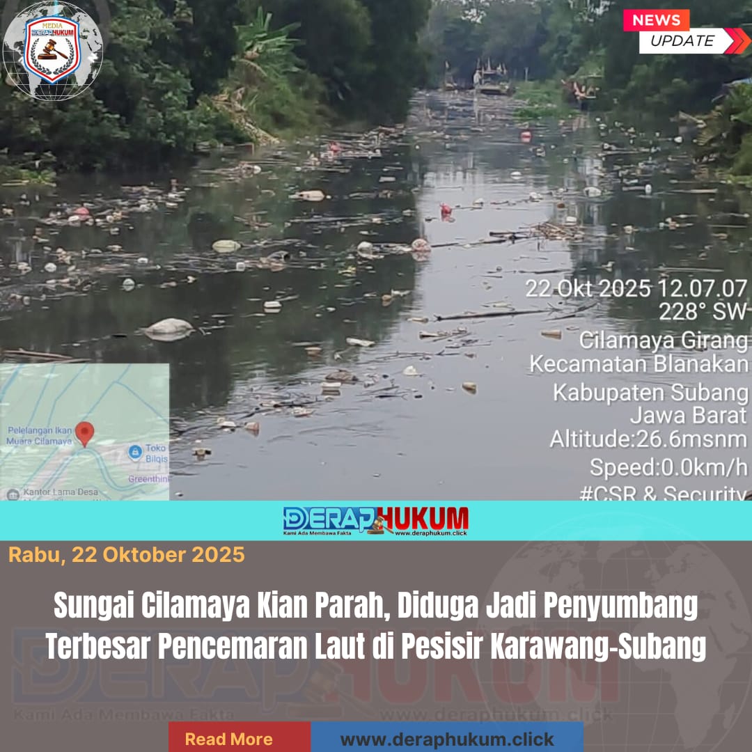 CILAMAYA, JAWA BARAT | Deraphukum.click | Kondisi Sungai Cilamaya pada Selasa (22/10/2025) siang kian memprihatinkan. Dari pantauan di lokasi, tepatnya di wilayah Desa Cilamaya Girang, Kecamatan Blanakan, Kabupaten Subang, permukaan sungai dipenuhi sampah plastik, limbah rumah tangga, hingga sisa material industri yang mengapung di sepanjang aliran menuju muara.
