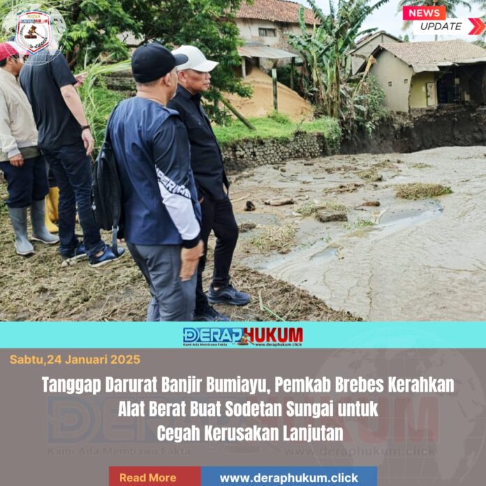 Brebes,Jawa Tengah | Deraphukum.click | Pemerintah Kabupaten (Pemkab) Brebes bergerak cepat menangani dampak banjir besar yang melanda Kecamatan Bumiayu akibat cuaca ekstrem. Sebagai langkah darurat, dua unit alat berat dikerahkan untuk membuat sodetan alur sungai guna mencegah luapan air kembali menghantam tebing sungai dan permukiman warga.