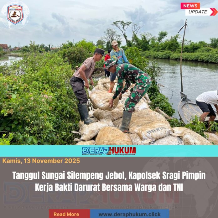 PEKALONGAN, JAWA TENGAH | DerapHukum.click | Polres Pekalongan – Polda Jateng – Bencana tanggul jebol di Sungai Silempeng, Desa Depok, Kecamatan Siwalan, Kabupaten Pekalongan, langsung ditangani cepat oleh tim gabungan. Kerja bakti darurat dipimpin langsung oleh Kapolsek Sragi, AKP Turkhan, S.H., pada Kamis (13/11/2025).