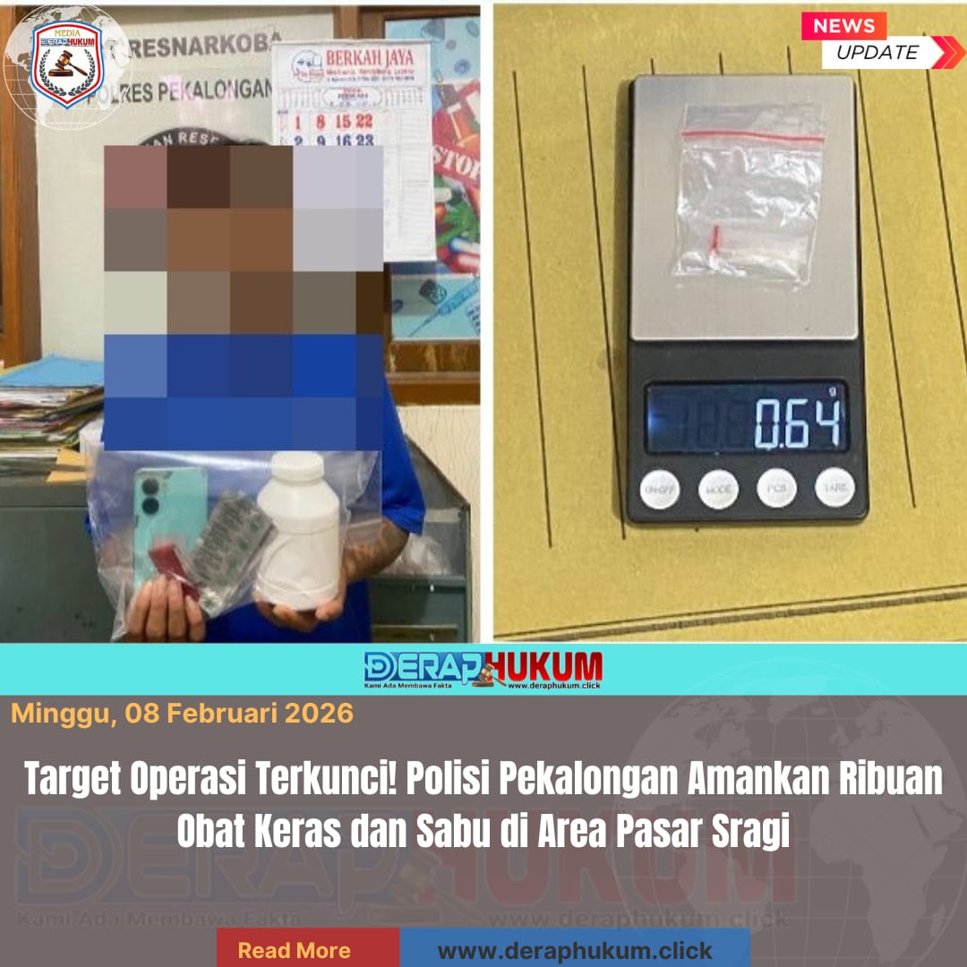 Pekalongan, Jawa Tengah | DerapHukum.click | Polres Pekalongan – Polda Jateng – Satresnarkoba Polres Pekalongan berhasil meringkus seorang pengedar narkoba lintas wilayah di kawasan Pasar Sragi, Jumat (6/2/2026) petang. Pelaku yang diketahui berinisial AA alias Suep (29), warga Comal, Pemalang, tak berkutik saat petugas menemukan “paket lengkap” narkotika mulai dari paket yang diduga sabu hingga ribuan butir obat keras di badannya.