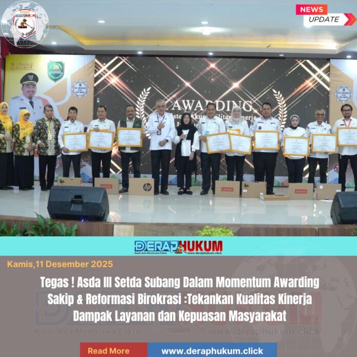 Subang,Jawa Barat l Deraphukum.click l Asisten Administrasi Umum (Asda II) Sekretariat Daerah (Setda) Kabupaten Subang, H. Dadang Kurnianudin, S.IP., M.Si., menghadiri kegiatan Awarding Sistem Akuntabilitas Kinerja Instansi Pemerintah (SAKIP) dan Reformasi Birokrasi (RB) Perangkat Daerah Tahun 2025 yang bertempat di Aula Pemda Subang, pada Rabu, (10/12/2025)