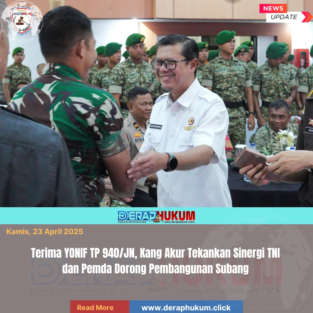 Subang,Jawa Barat l Deraphukum.click l Wakil Bupati Subang Agus Masykur Rosyadi menghadiri sekaligus melaksanakan penerimaan Batalyon Infanteri Teritorial Pembangunan 940/Jaya Negara (Yonif TP 940/JN) di Kabupaten Subang, yang berlangsung di Aula Oman Syahroni, Rabu (22/04/2026).