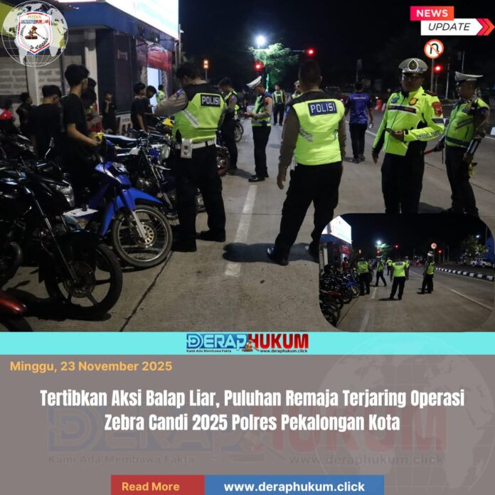 PEKALONGAN KOTA, | Deraphukum.click | Polres Pekalongan Kota – Polda Jateng – Menindaklanjuti keluhan dan keresahan masyarakat. Satgas Kamseltibcarlantas Operasi Zebra Candi 2025 Polres Pekalongan Kota melaksanakan kegiatan Represif berupa penertiban dan pencegahan aksi Balap liar di Jalur Interchange Exit Tol Setono, Sabtu (22/11/2025) malam.