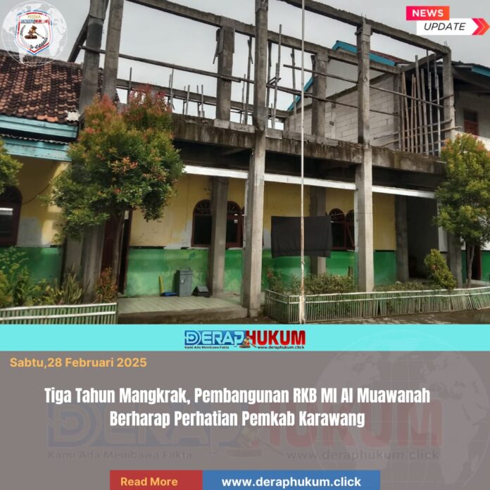 Karawang,Jawa Barat | Deraphukum.click | Pembangunan Ruang Kelas Baru (RKB) di MI Al Muawanah yang beralamat di Kampung Jambe, Desa Cilamaya, Kecamatan Cilamaya Wetan, Kabupaten Karawang, dilaporkan telah mangkrak selama kurang lebih tiga tahun terakhir.