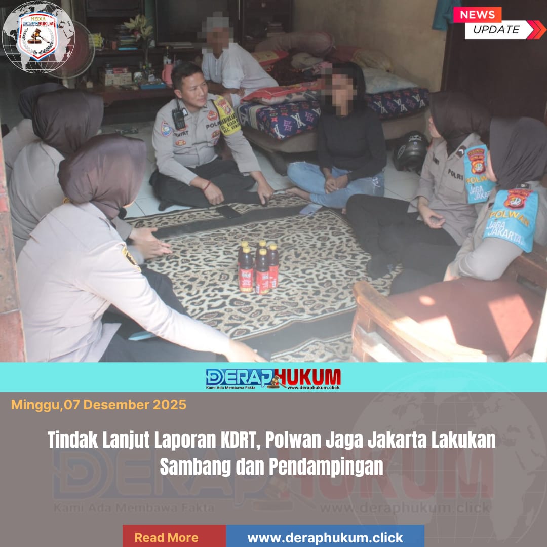 Jakarta Pusat, | Deraphukum.click | Jajaran Polwan Jaga Jakarta bersama Bhabinkamtibmas Kelurahan Kebon Kosong melakukan giat sambang korban kejahatan terkait dugaan Kekerasan Dalam Rumah Tangga (KDRT) di wilayah Kemayoran, Jakarta Pusat, Jumat (5/12/2025). Kegiatan yang berlangsung sejak pukul 08.30 WIB itu merupakan tindak lanjut dari Laporan Polisi B/3393/XI/2025/RESTRO JAKPUS/PMJ tertanggal 25 November 2025 mengenai dugaan tindak pidana penganiayaan dalam hubungan rumah tangga sebagaimana diatur Pasal 44 UU Nomor 23 Tahun 2004 tentang Penghapusan KDRT.