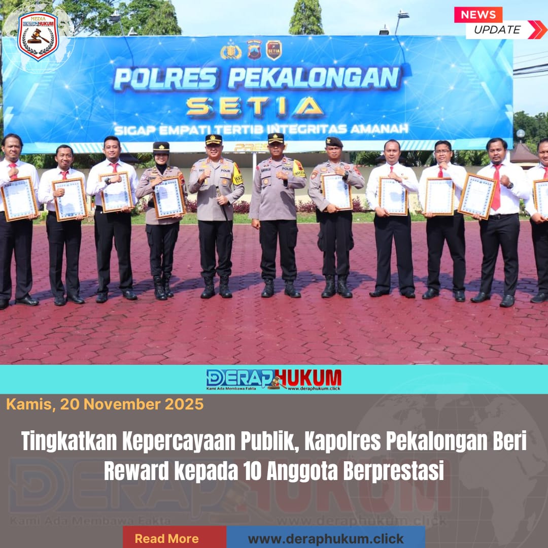 PEKALONGAN, Jawa Tengah | DerapHukum.click | Polres Pekalongan kembali memberikan apresiasi kepada personel yang menunjukkan kinerja, dedikasi, dan loyalitas tinggi. Apel pemberian penghargaan tersebut digelar secara khidmat di halaman Mapolres Pekalongan, Selasa (18/11/2025) pagi.