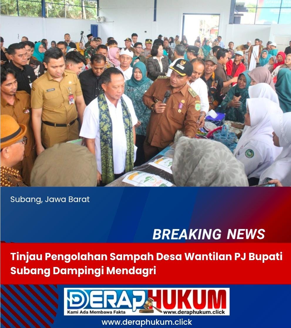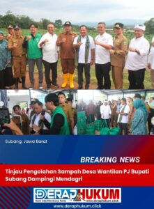 SUBANG-JABAR | Deraphukum.click | – Penjabat Bupati Subang, Drs. M. Ade Afriandi, M.T., mendampingi kunjungan kerja Menteri Dalam Negeri, Tito Karnavian, bersama Dirjen Perumahan Perdesaan Kementerian Perumahan dan Kawasan Permukiman, Dr. Drs. Imran, M.Si., M.A.Cd., serta Penjabat (Pj.) Gubernur Jawa Barat, Bey Machmudin. Kunjungan tersebut dilakukan untuk meninjau pengelolaan sampah di Desa Wantilan, Kecamatan Cipeundeuy, Subang, Selasa (21/01/2025).