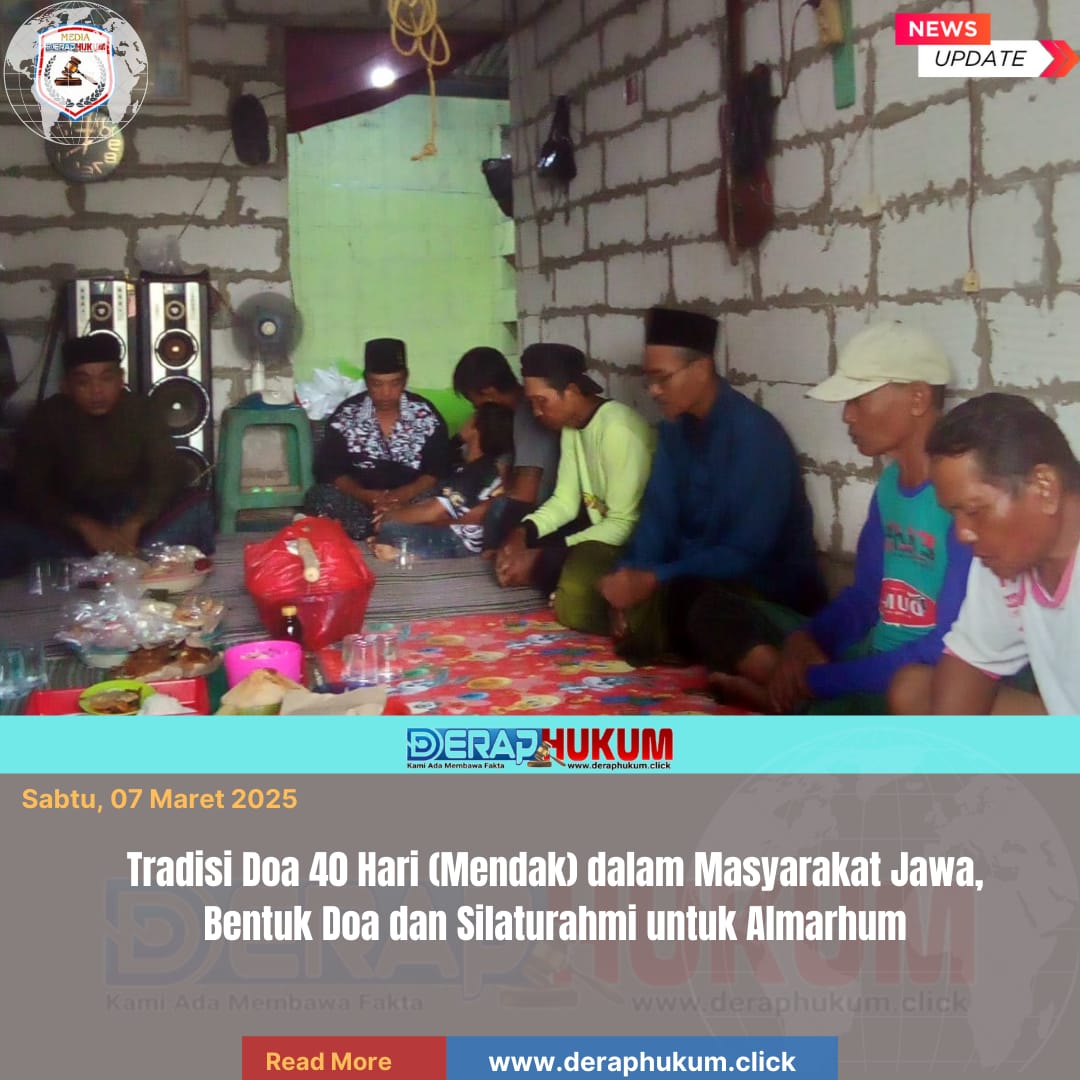 KARAWANG,Jawa Barat | Deraphukum.click | Dalam tradisi masyarakat Jawa, kegiatan mendak atau peringatan 40 hari setelah seseorang meninggal dunia masih menjadi bagian penting dalam kehidupan sosial dan budaya masyarakat. Tradisi ini biasanya dilaksanakan dengan mengadakan doa bersama atau tahlilan untuk mendoakan almarhum maupun almarhumah agar mendapatkan ampunan serta tempat terbaik di sisi Tuhan.