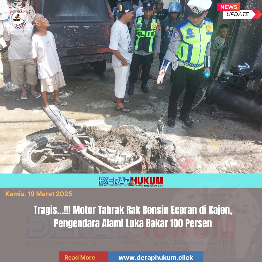 Pekalongan,Jawa Tengah | Deraphukum.click | Polres Pekalongan – Polda Jateng – Kecelakaan tragis yang memicu kebakaran hebat terjadi di Jalan Ki Ageng Giring, Desa Pekiringan Alit, Kecamatan Kajen, Kabupaten Pekalongan, Kamis (19/3/2026) pagi. Sebuah sepeda motor menabrak rak bensin eceran hingga mengakibatkan tiga orang mengalami luka bakar serius.