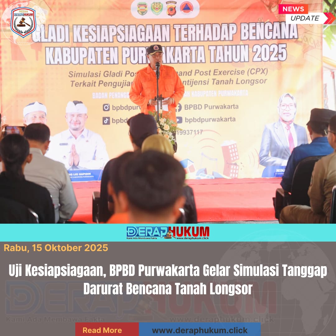 Purwakarta, Jawa Barat | Deraphukum.click | Dalam menghadapi tantangan perubahan iklim dan meningkatnya potensi bencana alam, Pemerintah Kabupaten Purwakarta melalui Badan Penanggulangan Bencana Daerah (BPBD) mengambil langkah proaktif dengan menggelar Gladi Kesiapsiagaan Bencana berupa Simulasi Gladi Posko atau Command Post Exercise (CPX).