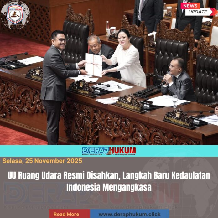 Jakarta | Deraphukum.click | Bertepatan dengan peringatan Hari Guru Nasional, Selasa (25/11), Dewan Perwakilan Rakyat Republik Indonesia resmi mengesahkan Undang-Undang Pengelolaan Ruang Udara. Pengesahan ini menjadi momentum penting bagi Indonesia, tidak hanya karena substansi regulasinya yang berkaitan langsung dengan kedaulatan negara, tetapi juga karena momen sidang yang disemarakkan dengan pantun dari Ketua Pansus RUU, Endipat Wijaya, sehingga suasana rapat terasa lebih hangat dan berwarna.