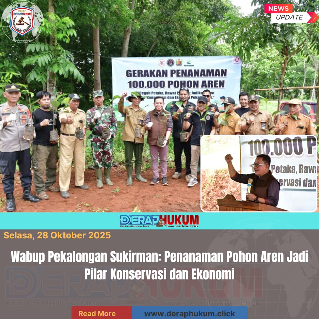 KAJEN, JAWA TENGAH | Deraphukum.click | Wakil Bupati (Wabup) Pekalongan, Sukirman, mewakili Bupati Pekalongan menghadiri kegiatan penanaman pohon aren yang diselenggarakan oleh organisasi masyarakat Grib Jaya dan LSM Sodo Lanang Nuswantoro, bekerja sama dengan Perum Perhutani KPH Pekalongan Timur. Kegiatan ini dilaksanakan di lahan Perhutani Desa Bukur, Kecamatan Bojong, Selasa (28/10/2025) siang.
