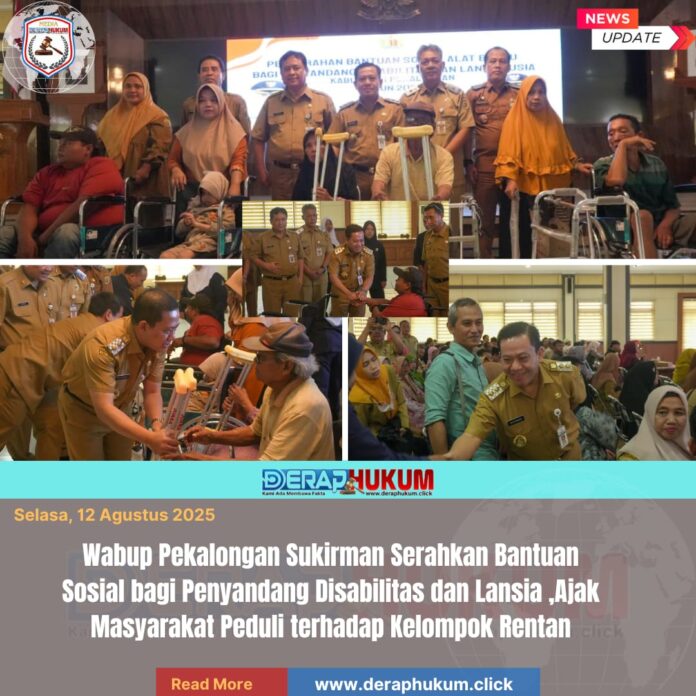 Kajen, | Deraphukum.click | Pemerintah Kabupaten (Pemkab) Pekalongan kembali menunjukkan komitmennya dalam mendukung kelompok rentan dengan menyalurkan bantuan sosial berupa alat bantu kepada penyandang disabilitas dan lansia. Kegiatan ini dihadiri langsung oleh Wakil Bupati Pekalongan, H. Sukirman, S.S., M.S., di Aula Setda Lt. 1, Kajen, selasa (12/8/2025).