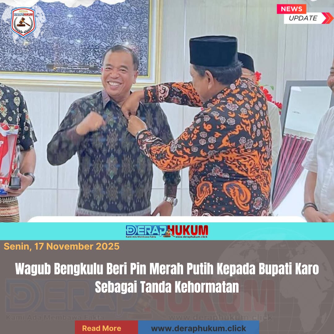 Bupati Karo Brigjen Pol (Purn.) Dr. dr. Antonius Ginting, Sp.OG., M.Kes., menerima penyematan Pin Merah Putih dari Wakil Gubernur (Wagub) Bengkulu, H. Mian, dalam audiensi resmi di kantor Pemerintah Provinsi Bengkulu pada hari Jumat (14/11/2025) kemarin.