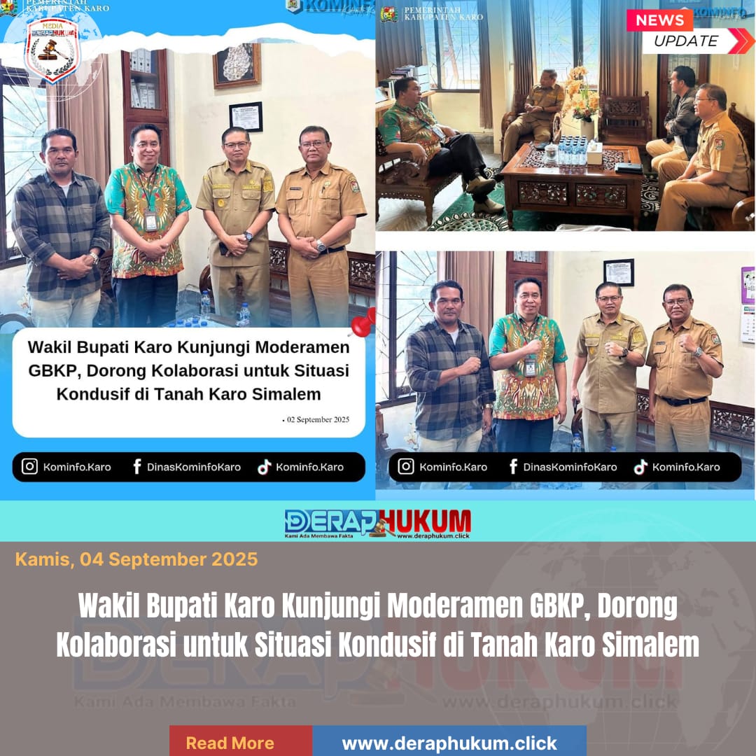 Wakil Bupati, Komando Tarigan, SP., dengan Kepala Kesbangpol, Tetap Ginting, S.Sos., Wakil Ketua DPRD, Imanuel Sembiring., dan Sekretaris Umum Moderamen GBKP, Pdt.Yunus Bangun, M.Th., berdiskusi Terkait Surat Partoral Moderamen GBKP atas Situasi Terkini Bangsa Indonesia yang berisi Himbauan bagi Seluruh Jemaat GBKP dan Masyarakat di Kantor Moderamen GBKP pada Selasa (2/9/2025)