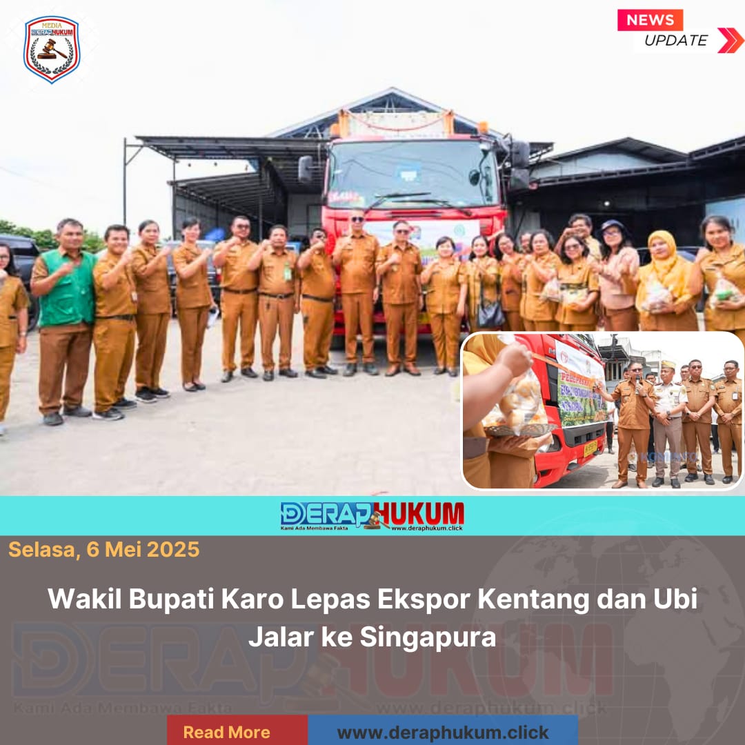 KARO, Sumatra Utara | Deraphukum.click | Wakil Bupati Karo, Komando Tarigan, S.P., secara resmi melepas ekspor komoditas pertanian berupa kentang dan ubi jalar ke Singapura. Ekspor ini merupakan hasil kerja sama antara Alamanda Singapore Pte Ltd dan PT Gabe Tiga Puluh. Acara pelepasan berlangsung di Gudang PT Koncota Agro Mandiri, Desa Gurusinga, Kecamatan Berastagi, Senin (5/5/2025).