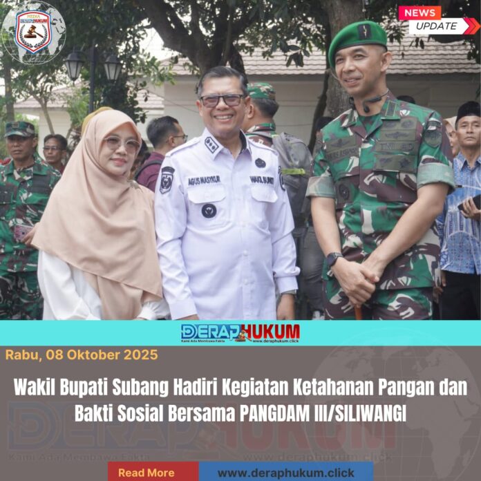 Subang, Jawa Barat l Deraphukum.Click l Wakil Bupati Subang, H. Agus Masykur Rosyadi, S.Si., M.M didampingi Sekretaris Daerah Kabupaten Subang, H. Asep Nuroni, S.Sos., M.Si menghadiri kegiatan Ketahanan Pangan dan Bakti Sosial Pangdam III/Siliwangi yang berlangsung di Desa Sidajaya–Sidamulya, Kecamatan Cipunagara, Rabu (08/10/2025).