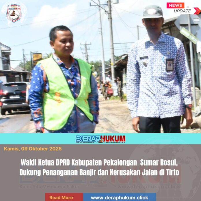 Pekalongan,Jawa Tengah | Deraphukum.click | Wakil Ketua DPRD Kabupaten Pekalongan, Sumar Rosul, secara resmi memberikan apresiasi dan dukungan penuh terhadap pemerintah daerah yang menunjukkan komitmen serius dalam menangani permasalahan banjir serta perbaikan infrastruktur jalan yang rusak di wilayah Tirto dan sekitarnya.( 08/10/2025 )