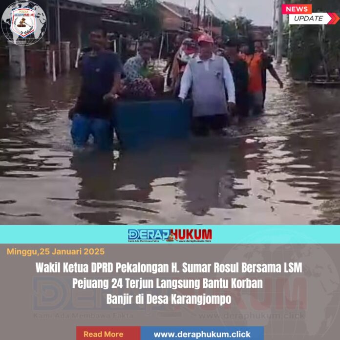 Pekalongan,Jawa Tengah | Deraphukum.click | 24 Januari 2026 – Bencana banjir melanda wilayah pesisir Pantura, khususnya Desa Karangjompo, Kecamatan Tirto, Kabupaten Pekalongan. Dalam rangka menunjukkan kepedulian dan tanggung jawab terhadap kondisi masyarakat terdampak, Wakil Ketua DPRD Pekalongan, H. Sumar Rosul, S.IP., M.AP., bersama dengan anggota LSM Pejuang 24, terjun langsung ke lokasi pada hari ini (24/1/2026).