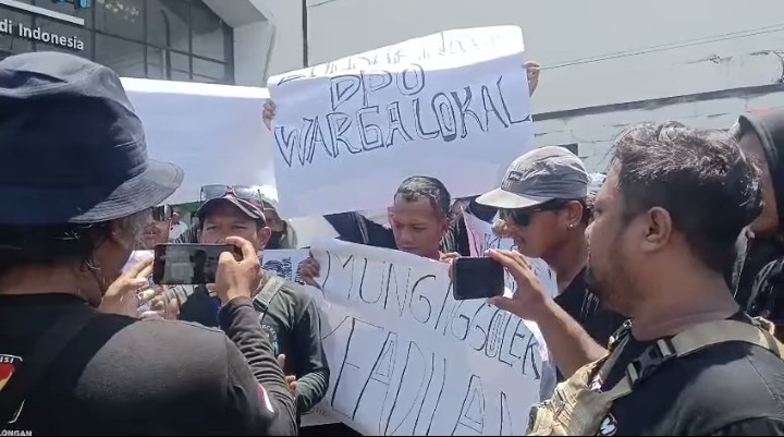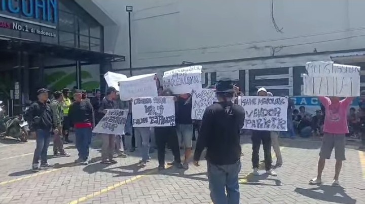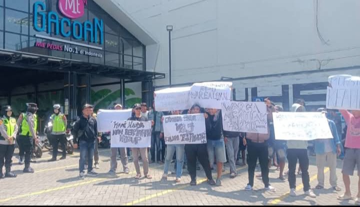 Pekalongan,Jawa Tengah | Deraphukum.click | Puluhan warga menggelar aksi protes di depan gerai Mie Gacoan di Jalan Imam Bonjol, Kota Pekalongan, Sabtu (11/4/2026) siang. Mereka membentangkan spanduk di akses pintu masuk sebagai bentuk penolakan terhadap rencana penerapan sistem parkir elektronik (e-parking) oleh manajemen.