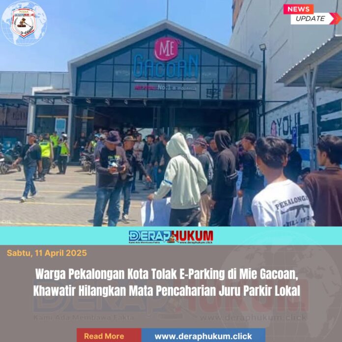 Pekalongan,Jawa Tengah | Deraphukum.click | Puluhan warga menggelar aksi protes di depan gerai Mie Gacoan di Jalan Imam Bonjol, Kota Pekalongan, Sabtu (11/4/2026) siang. Mereka membentangkan spanduk di akses pintu masuk sebagai bentuk penolakan terhadap rencana penerapan sistem parkir elektronik (e-parking) oleh manajemen.